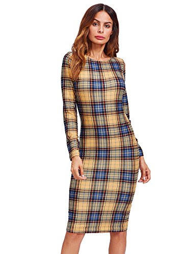 - 95% Polyester, 5% Spandex. Crew Neck, Long Sleeve, Plaid, bodycon design, Sheath dress